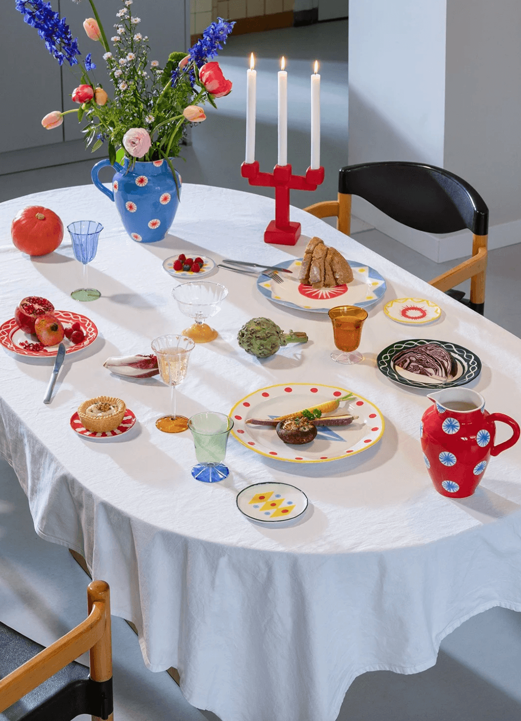 Een set kandelaren die met de hand zijn geschilderd in samenwerking met de Engelse keramist Hal Haines, met vrolijke kleuren. Het palet met gelen, blauw, rood, wit verlenen een speelse esthetiek. De kandelaar kan worden geplaatst in de woonkamer, op een boekenkast om zachte lichtpunten te creëren, in het midden van de tafel tijdens het diner of op de vensterbank voor een romantische hoek.