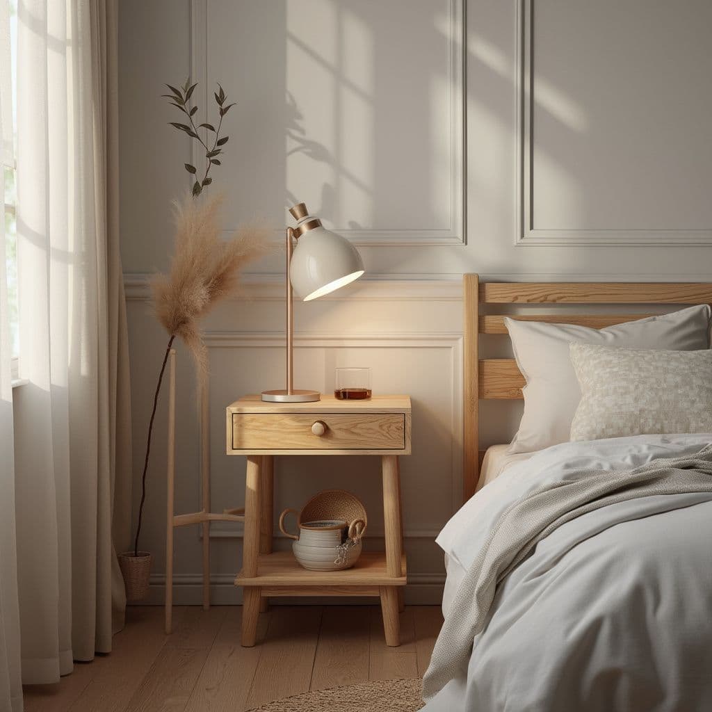 Tover de slaapkamer om met een houten nachtkastje. Door het natuurlijke materiaal creëer je een rustgevende uitstraling in je slaapkamer, waar je helemaal tot rust kunt komen.