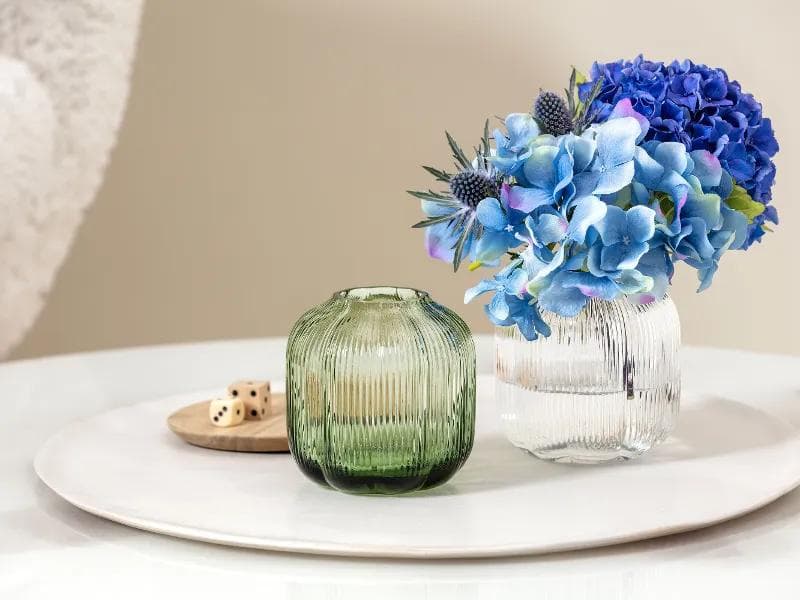 Een prachtige vaas met een verticaal geribbeld ontwerp, verkrijgbaar in groen of transparant. Het design is hedendaags, met een afgeronde en evenwichtige silhouet, ideaal voor bloemstukken van gemiddelde grootte.