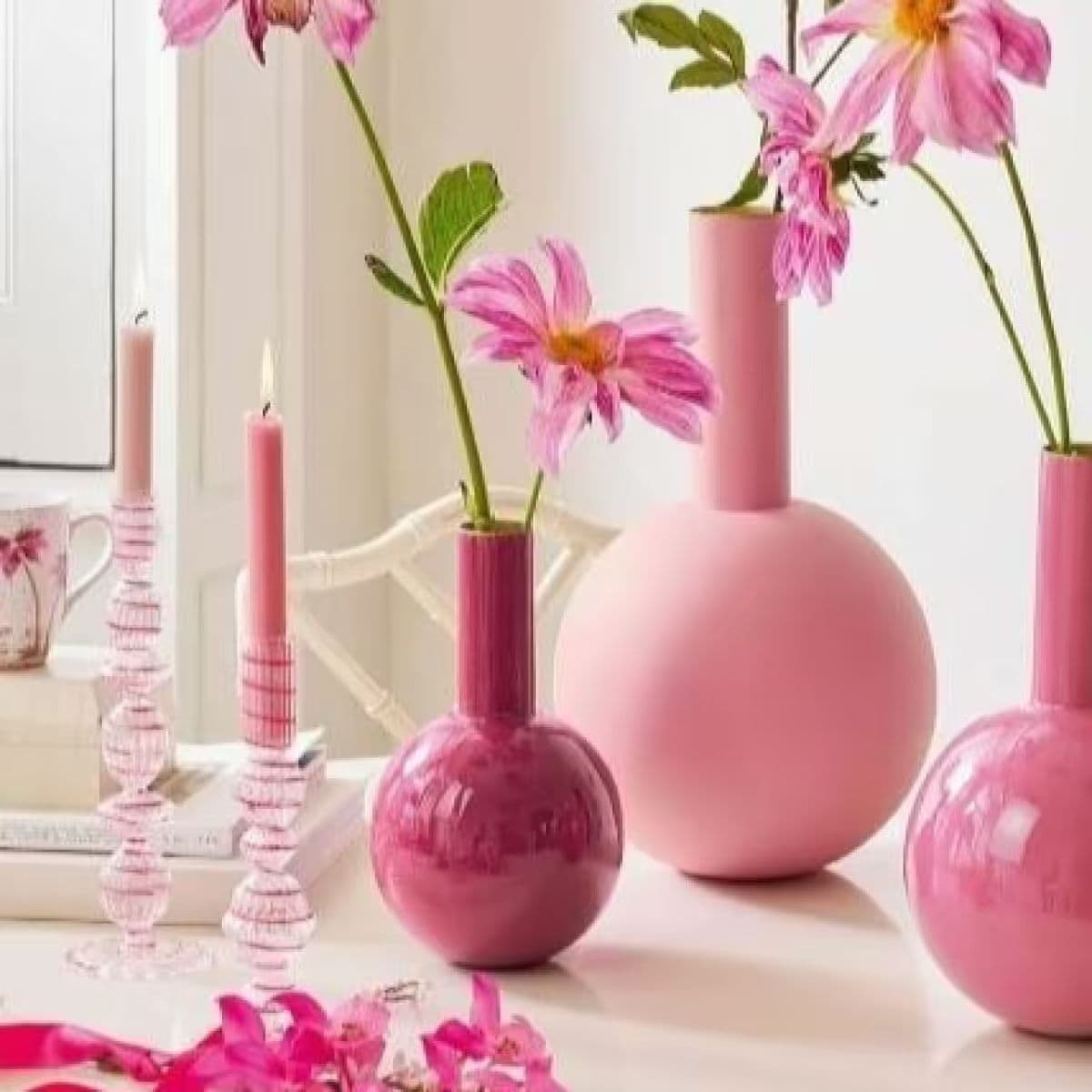De hedendaagse silhouet met bolvormige basis en dunne cilindrische hals valt op, ook dankzij de bubble gum kleur die de rode en oranje tinten van de bloemen begeleidt. Het minimalistische design benadrukt het bloemstuk.
