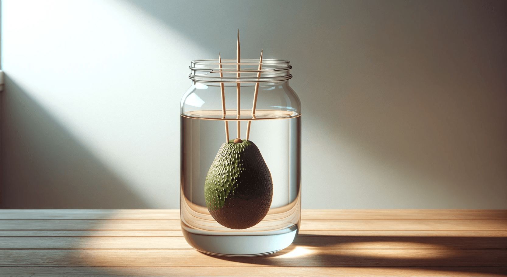 Steek drie tandenstokers in de pit, op gelijke hoogte. Het is de bedoeling dat de pit ongeveer 2,5 cm in het water hangt. Met tandenstokers is het makkelijk om je pit goed te positioneren.